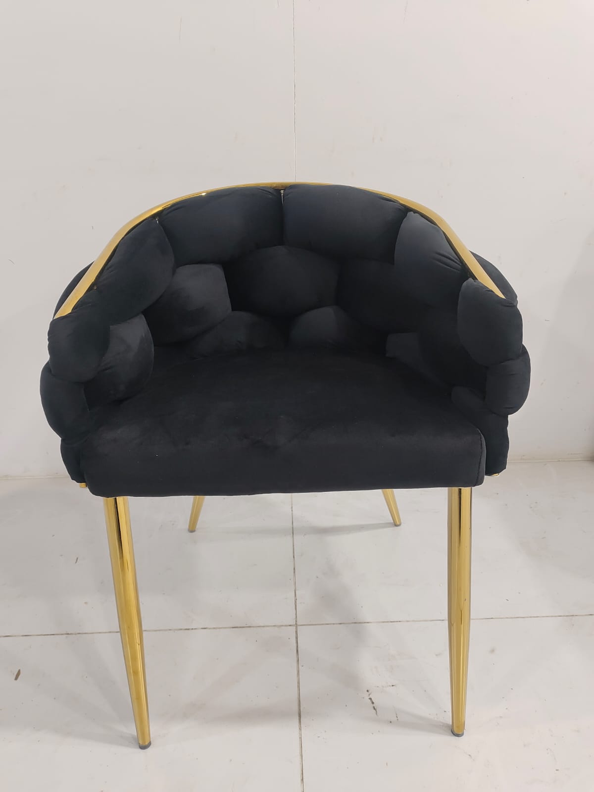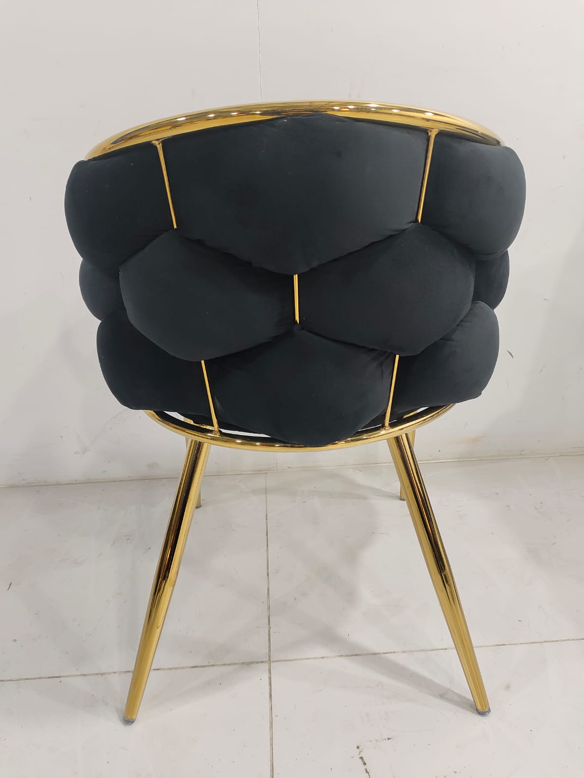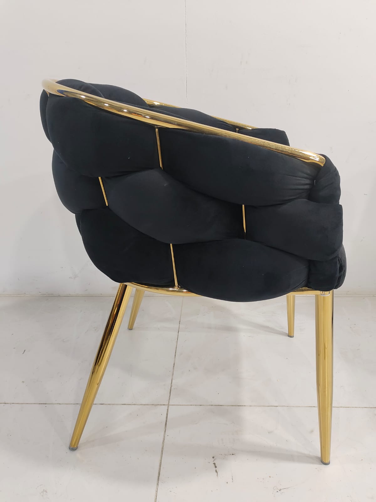 Chaise élégante avec assise en velours doux et piètement en acier doré, alliant confort et raffinement pour une touche de luxe dans votre intérieur.