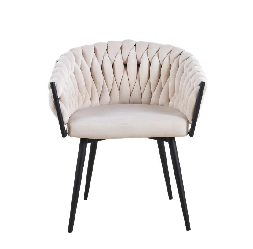 CHAISE AVEC ACCOUDOIR TRESSÉE – VELOURS BEIGE & PIEDS EN MÉTAL NOIR