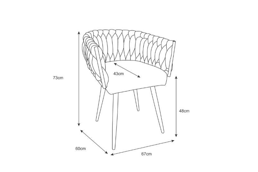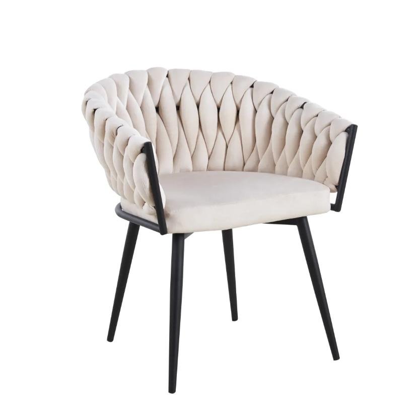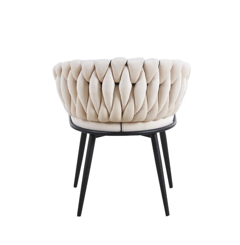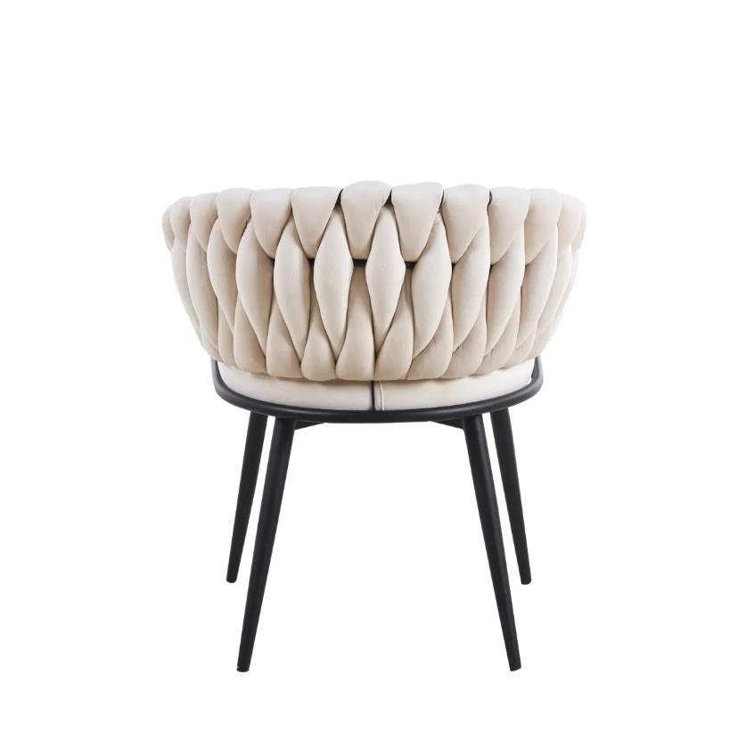 Revêtue d’un velours beige doux et chaleureux, elle séduit par ses accoudoirs tressés à la main et sa structure en métal noir robuste. Confortable et tendance, elle est parfaite pour une salle à manger, un coin bureau ou un espace lounge.