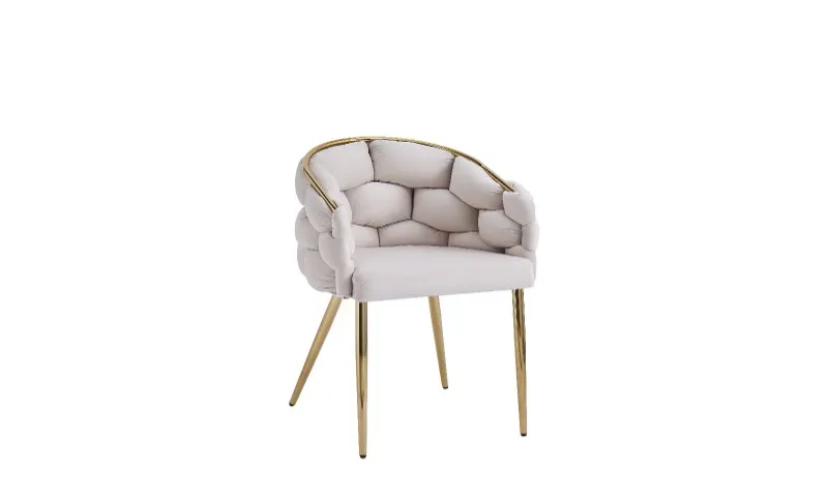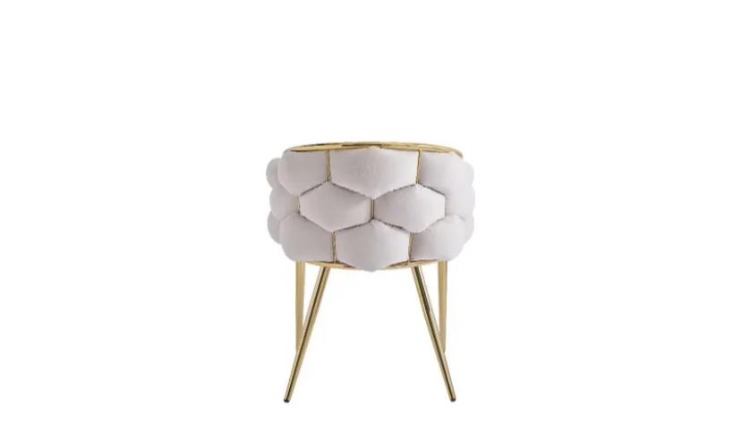 Son assise arrondie en velours beige offre un confort moelleux et raffiné, tandis que sa structure en métal doré illumine l’espace avec élégance. Idéale pour une salle à manger, un coin maquillage ou un espace lounge chic.