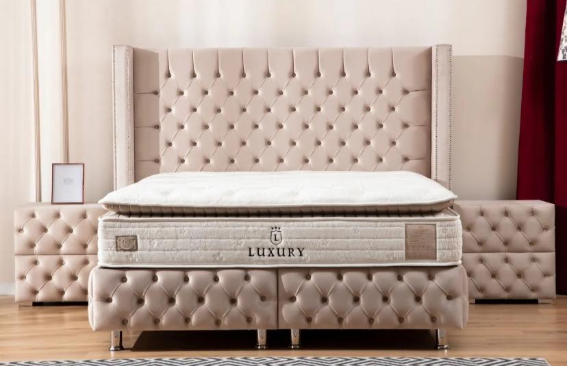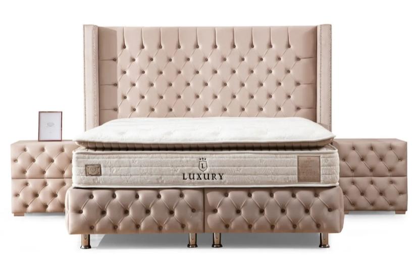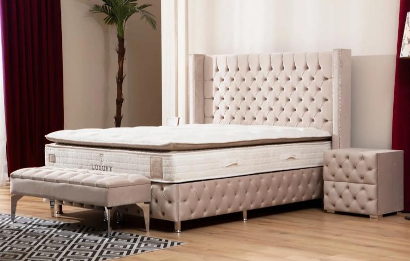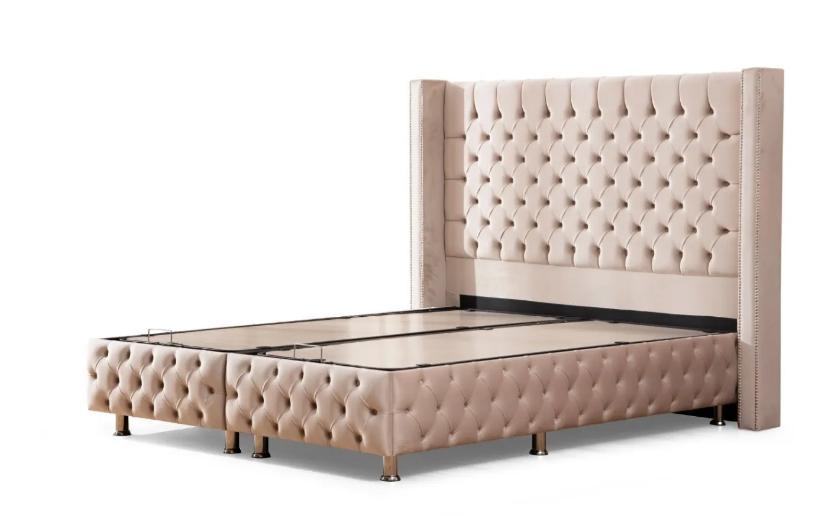 LIT COFFRE CLOUTÉ – VELOURS BEIGE 160×200 cm