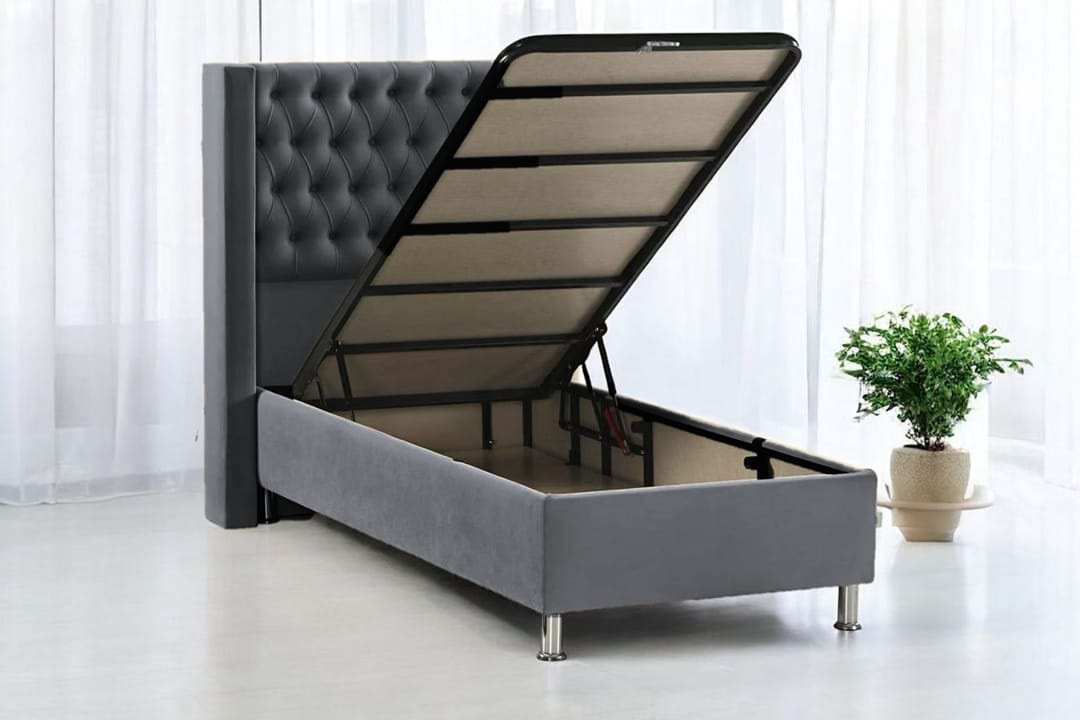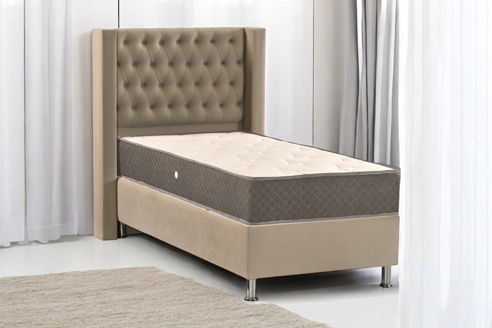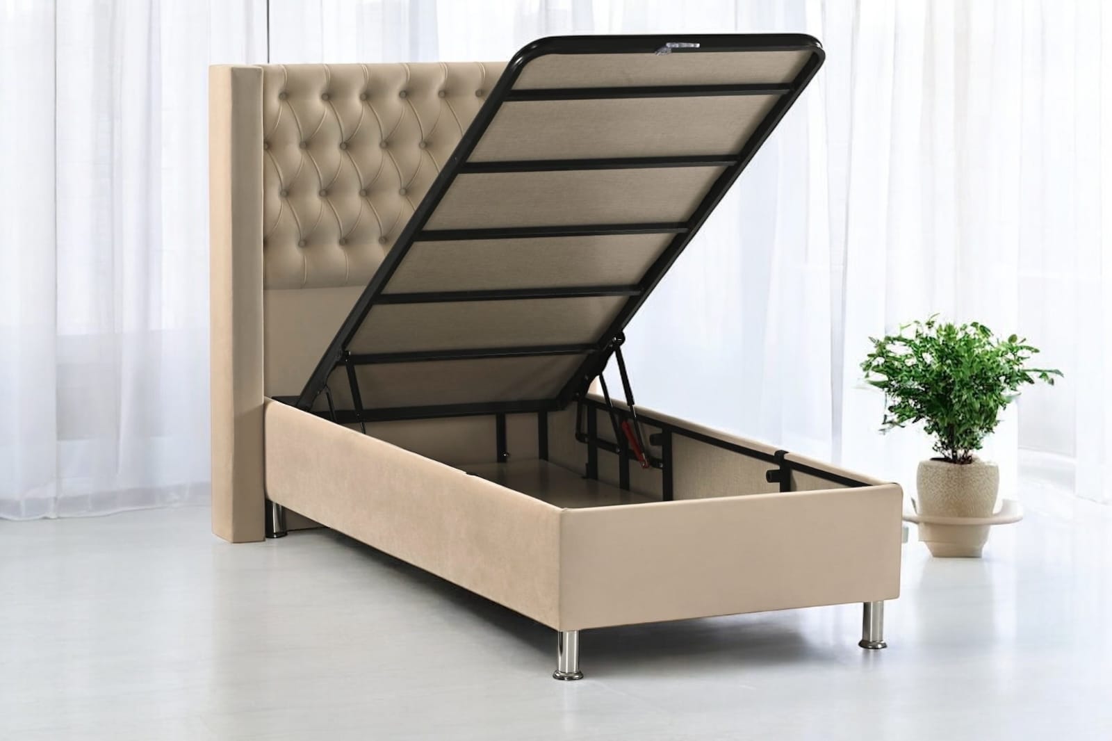 Offrez à votre chambre une touche chic et intelligente avec le Lit VENUS 90×190 en velours taupe. Compact, élégant et fonctionnel, il est idéal pour les petits espaces sans compromis sur le confort. Son coffre intégré offre un grand espace de rangement caché pour optimiser chaque m².